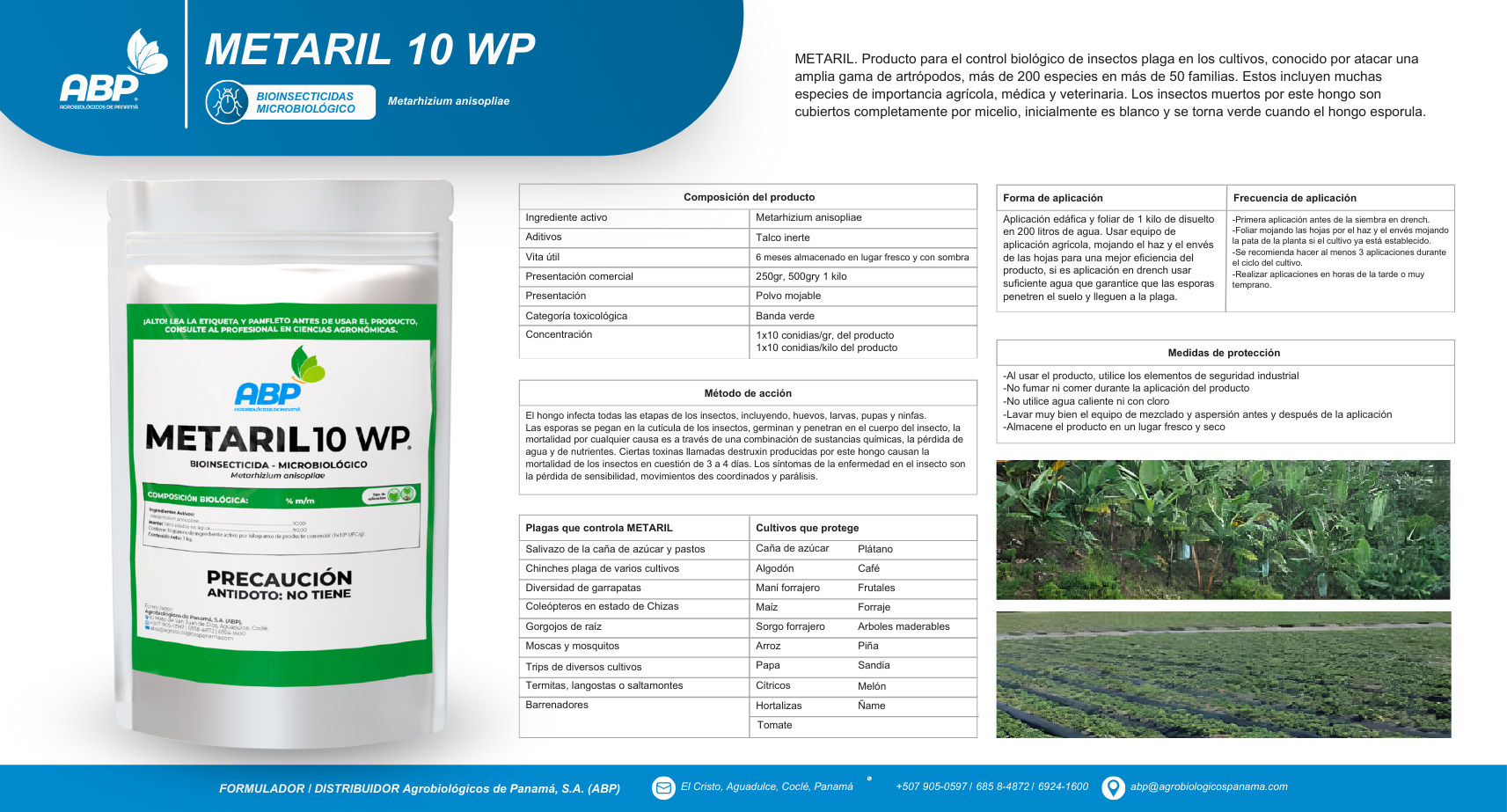 Producto para el control biológico de insectos plaga en los cultivos, conocido por atacar a una amplia gama de artrópodos, más de 200 especies en más de 50 familias. Estos incluyen muchas especies de importancia agrícola, médica y veterinaria. Los insectos muertos por este hongo son cubiertos completamente por micelio, inicialmente es blanco y se torna verde cuando el hongo esporula.